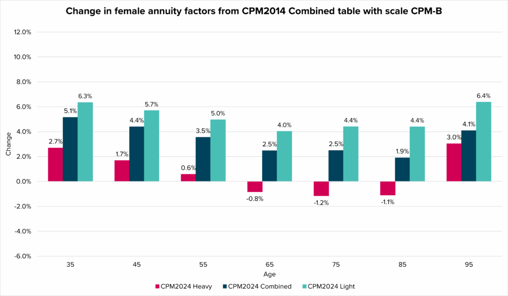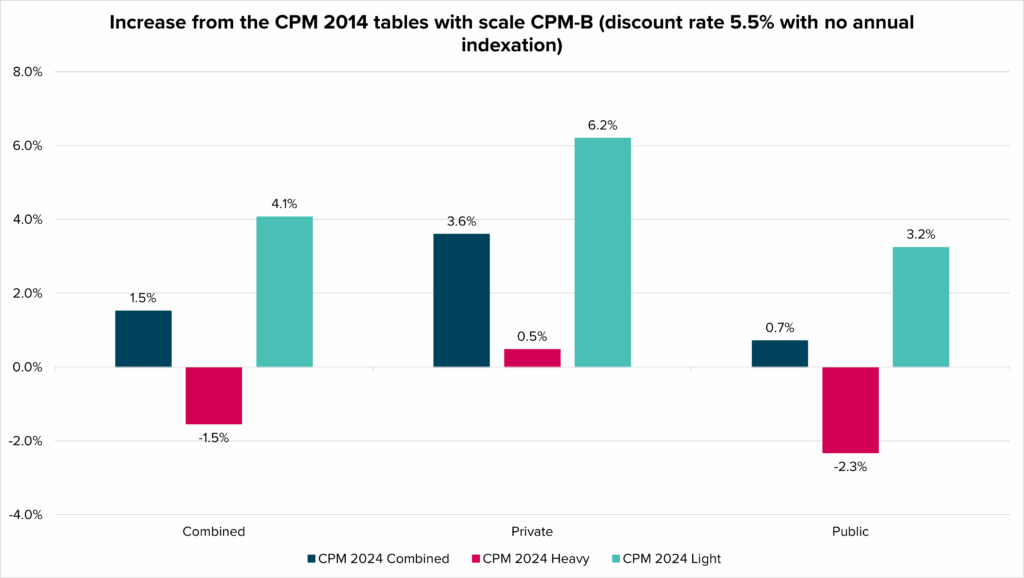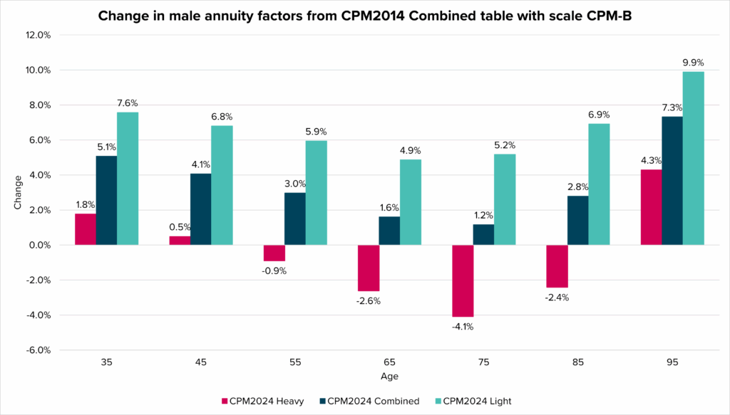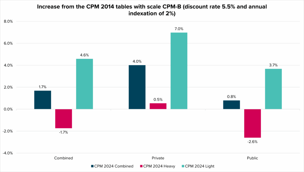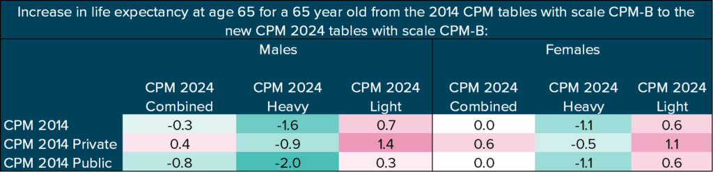 As demonstrated above, the liability impact of changing mortality assumptions depends on both the current table and the table being adopted. When the new MI‑CAN‑2024 improvement scale is adopted alongside the CPM 2024 tables, it is more likely than not that liabilities will increase if either the Combined or Light table is selected.