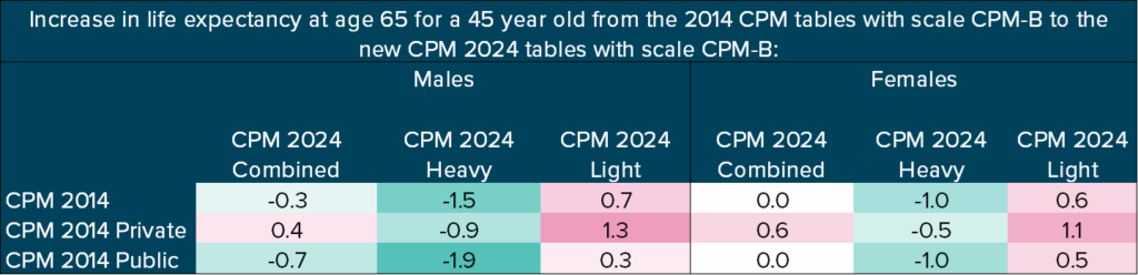- The Canadian Institute of Actuaries has released the CPM 2024 tables, expected to replace the CPM 2014 tables and reflecting more recent pensioner mortality experience in Canada.