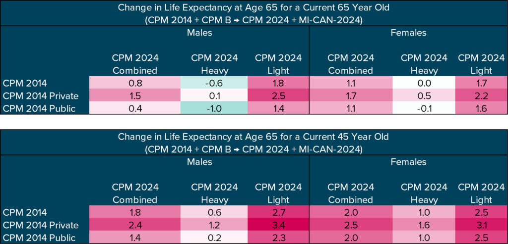 When the new MI‑CAN‑2024 mortality improvement scale is adopted in conjunction with the CPM 2024 tables, the combined impact on life expectancy becomes more pronounced. The tables below illustrate this combined effect.