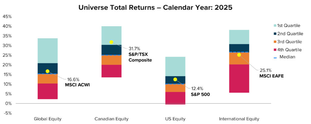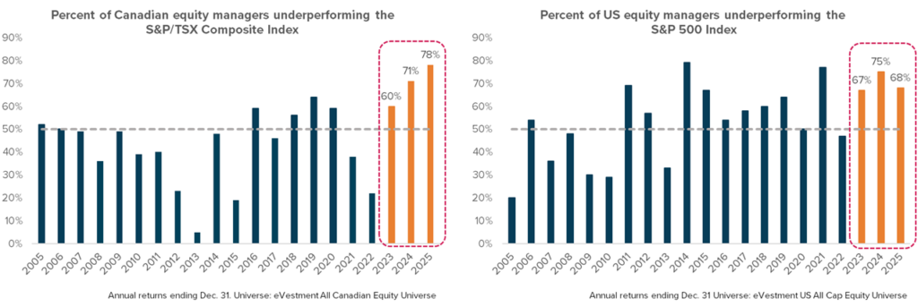 Driven mainly by a small cohort of index constituents, equity markets in 2025 delivered strong headline returns (The “beta”). This made it difficult for active equity managers (where we expect the “alpha” to come from) — especially in North America. Outside North America, index dominance was less pronounced and active managers performed better.