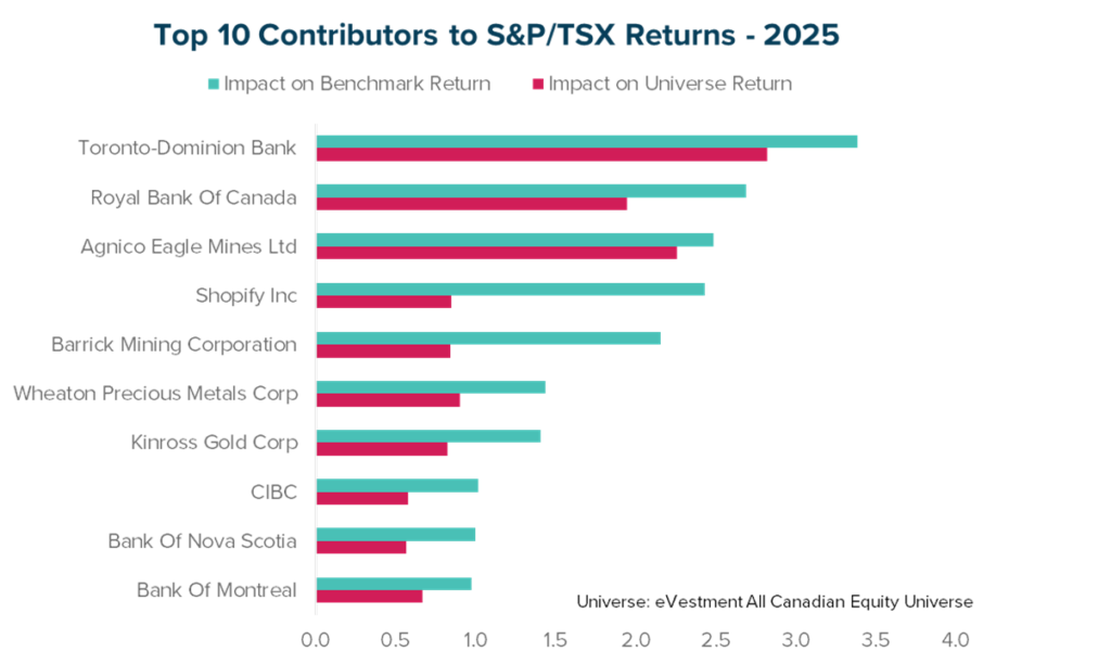 Many active managers held fewer of these exposures due to valuation, volatility, and risk controls. This led to notable underperformance, as the top ten S&P/TSX Composite contributors made up approximately 30% of the index weight and accounted for over half of the index returns, but had less presence in active portfolios. This result reflects concentrated market leadership outweighing diversified strategies, making performance hinge on just a few stocks.