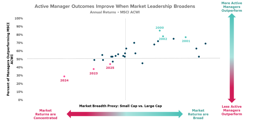 Historically, narrow market leadership limits opportunities for active outperformance, while broader markets benefit stock pickers. Investors should use this time to review portfolio structure, compare active and passive roles, and ensure manager approaches align with their stated philosophy and risk measures.