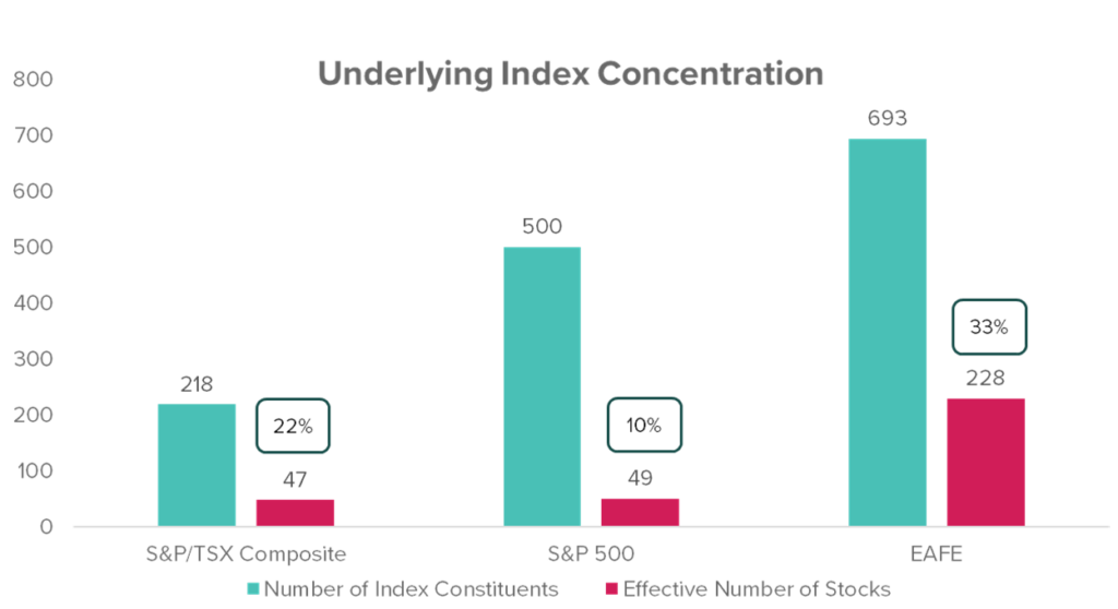 While North American indices like the S&P 500 and S&P/TSX Composite have many constituents, relatively few stocks drive most of the risk and returns — often just a handful of mega-cap names. In contrast, international markets such as those tracked by the MSCI EAFE index feature higher effective breadth, with returns spread across more stocks, reducing the impact of any single company or sector.